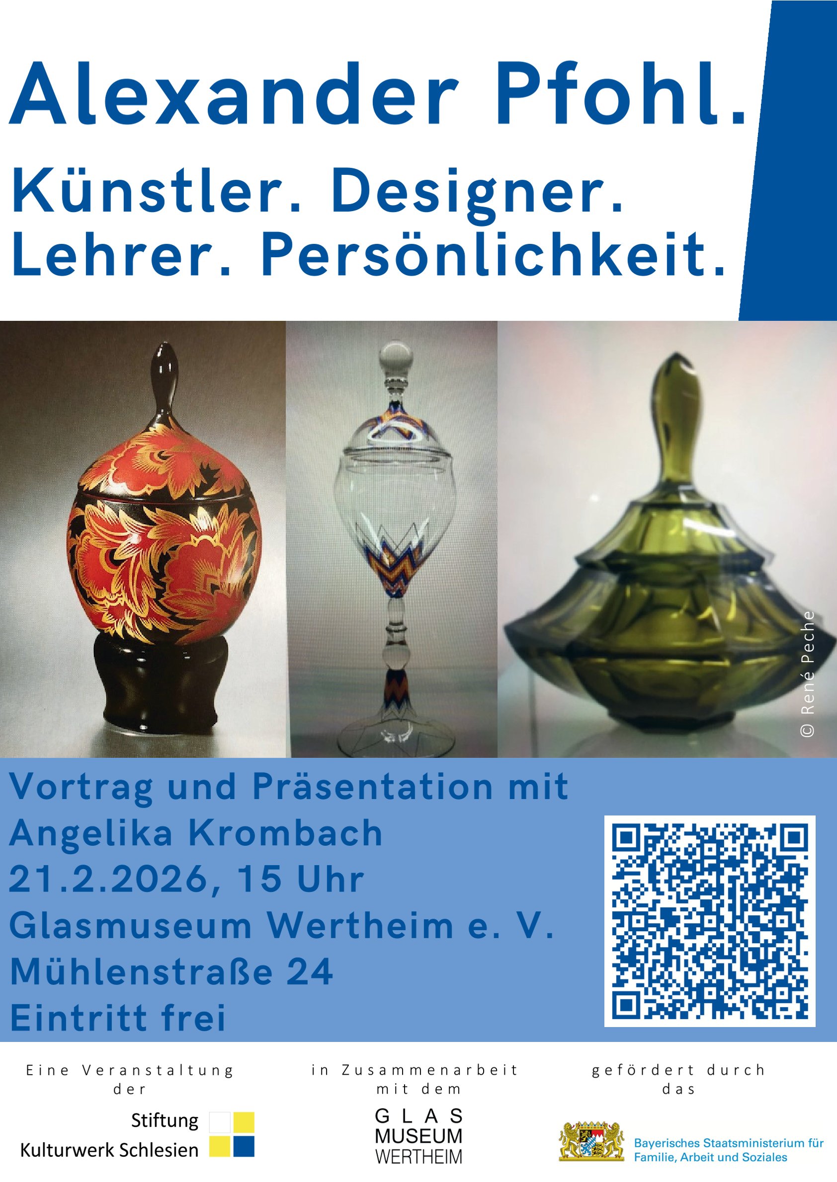 Am 21.2.2026 um 15 Uhr lädt die Stiftung Kulturwerk Schlesien in Zusammenarbeit mit dem Glasmuseum Wertheim e. V. zu einem Vortrag mit Präsentation über Alexander Pfohl ein – Künstler, Designer, Lehrer und prägende Persönlichkeit der deutschen Glaskunst des 20. Jahrhunderts. Die Veranstaltung findet im Glasmuseum Wertheim e. V., Mühlenstraße 24, statt. Der Eintritt ist frei.