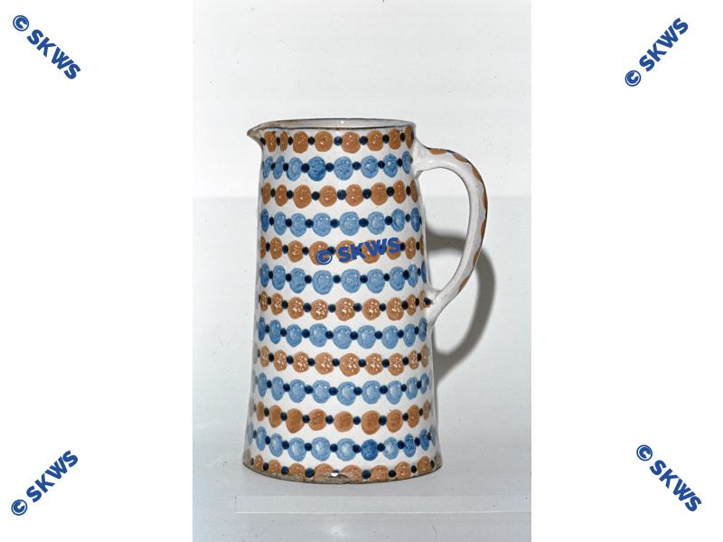 Krug (hohes Gefäß) sogenannte "Schnelle"?; handgedreht, weißer Anguss auf braunem Scherben mit umlalufenden Reihen von blau-braunen Punkten (Schwämmel-Dekor) Töpferei Jürgel, Pulsnitz um 1930